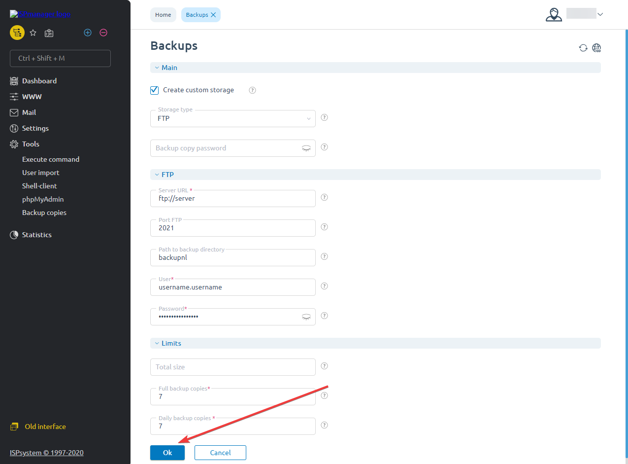 Ulterior faceți clic pe OK și copia de rezervă a hosting-ului va fi configurată!