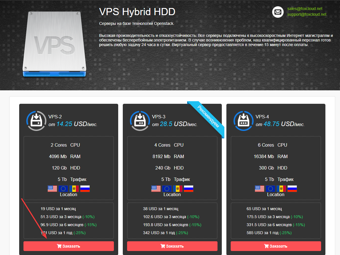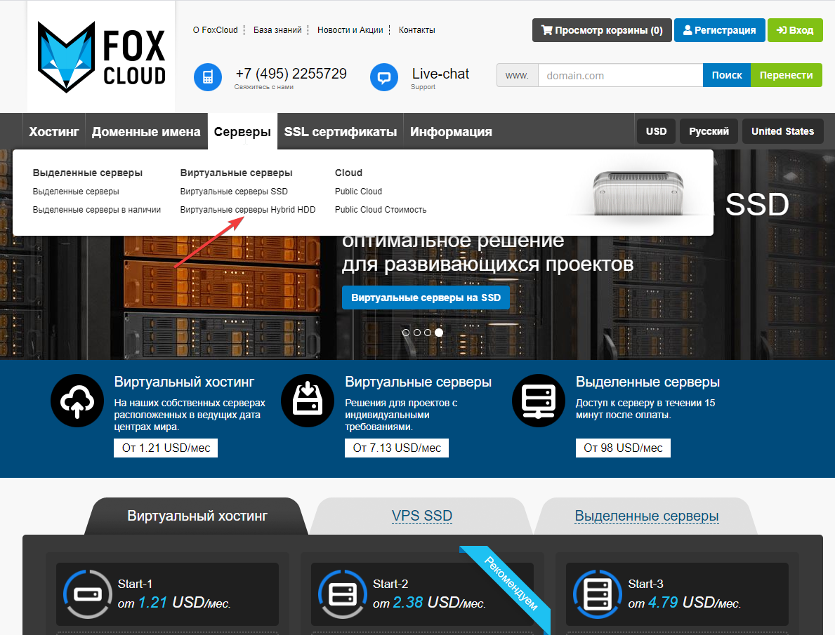 În meniul site-ului selectați Servere virtuale SSD sau Servere virtuale Hybrid HDD