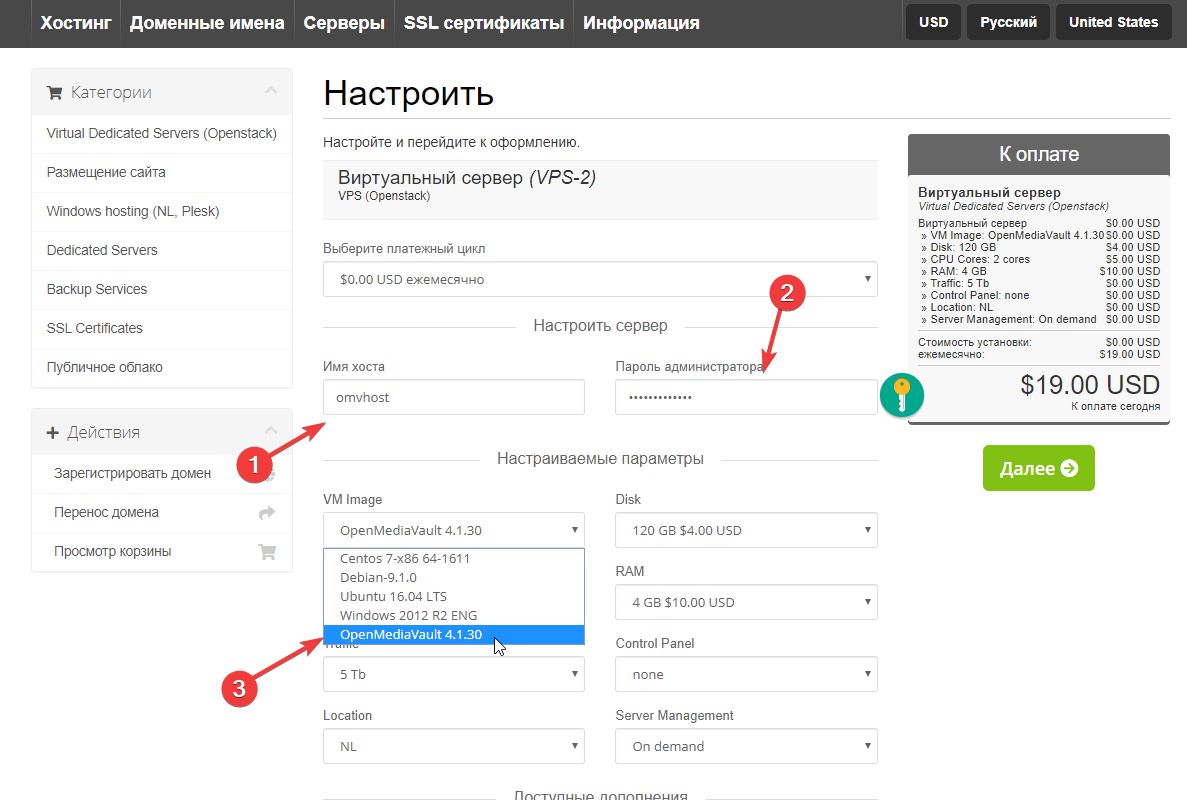 În câmpurile corespunzătoare introduceți denumirea serverului (1), parola de acces (2) și selectați imaginea OpenMediaVault (3). După aceasta tastați butonul Continuă. (imagine-3)