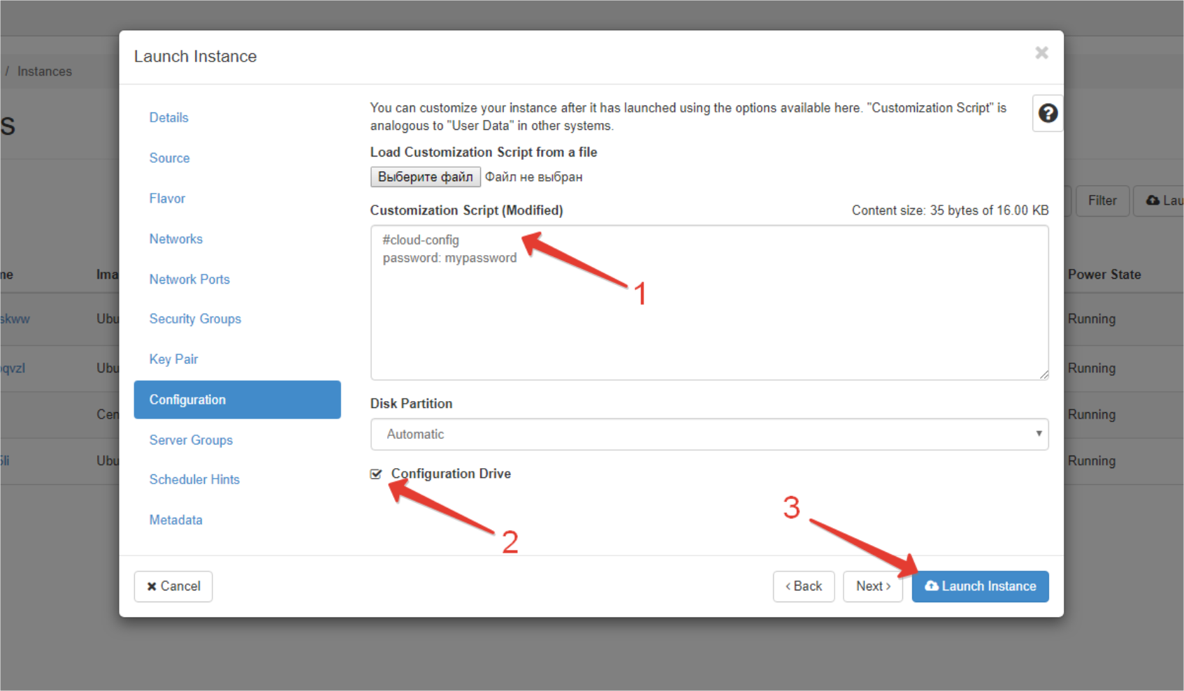 Asigurați-vă că ați bifat cîmpul "ConfigurationDrive" (pas-2) și în final faceți click pe butonul "LaunchInstance" (pas-3).- Așteptați până când statutul noului server virtual se va schimbă în „Active”.