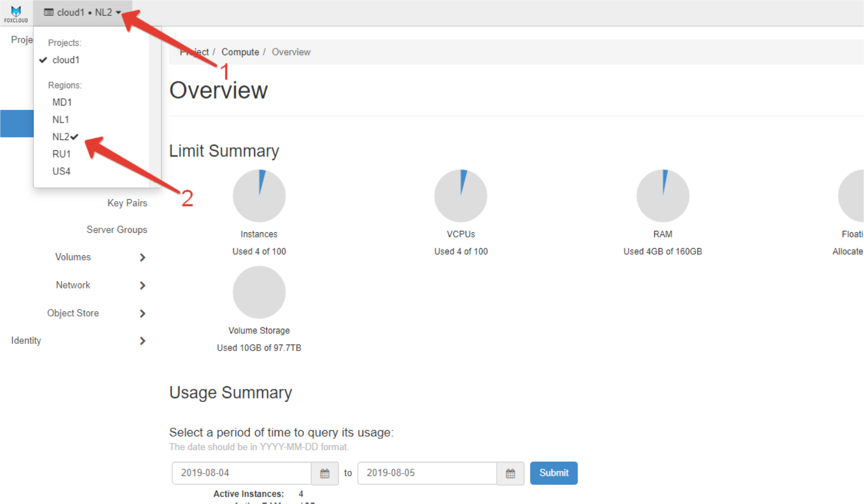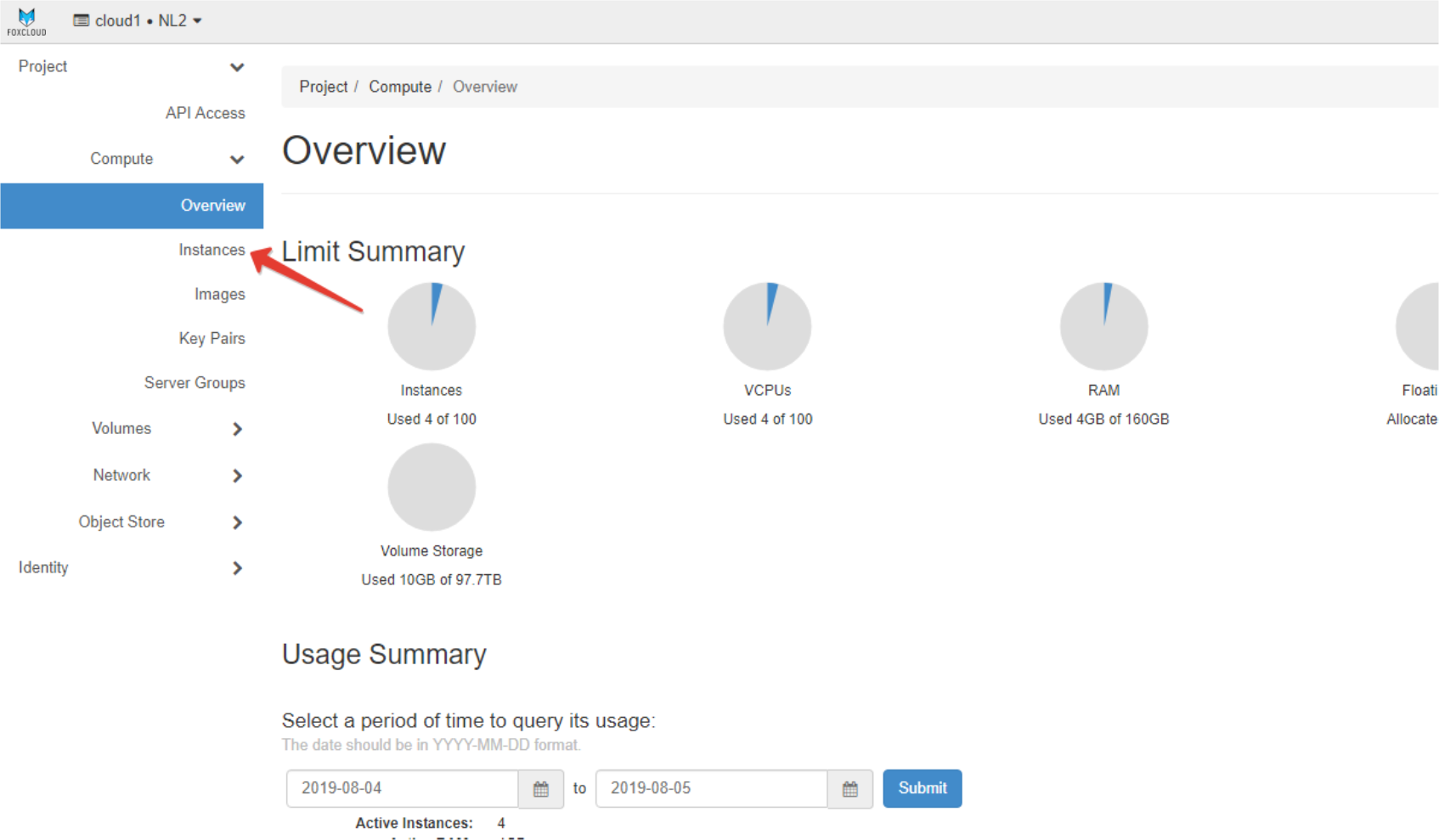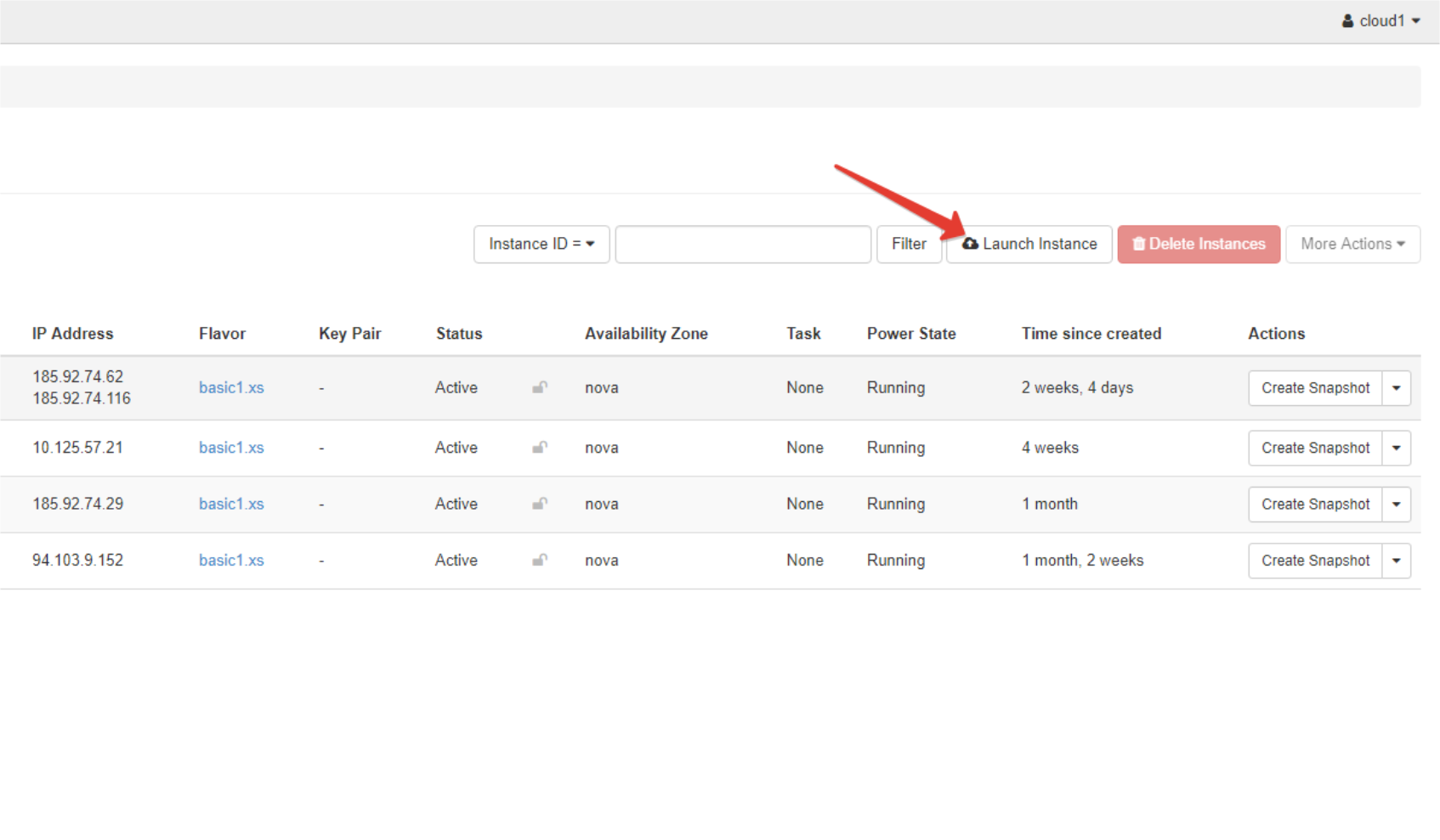 - Faceți click pe fișierul „Instances” care afișează lista serverelor virtuale ale utilizatorului din regiunea curentă.