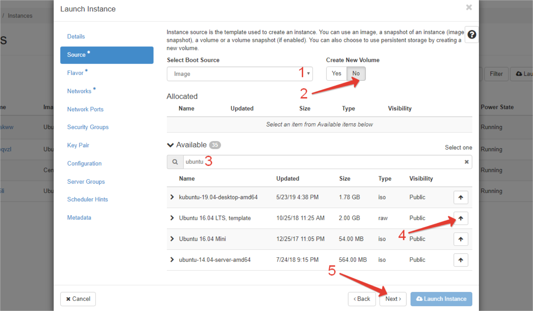 Serverul virtual poate fi lansat în OpenStack Horizon din diverse surse: