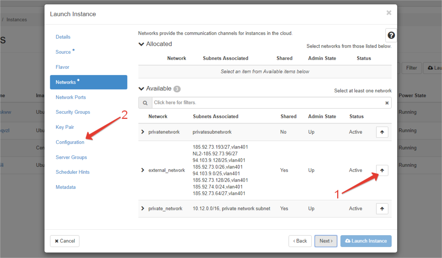 - Se va deschide un fișier cu lista rețelelor disponibile. Faceți click pe butonul alături de "external_network" (pas-1) și faceți click pe fișierul "Configuration" (pas-2).