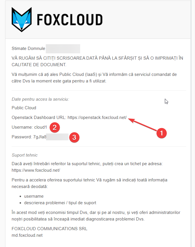 - Deschideți scrisoarea de activare a serviciului "PublicCloud",