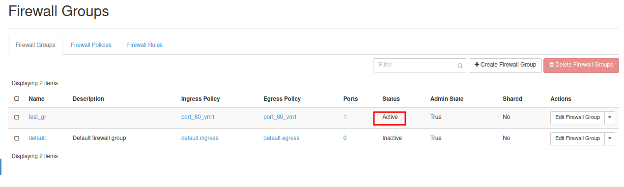 7. Accesați fila „Firewall Groups” pentru a verifica dacă statutul grupului de reguli este activ.