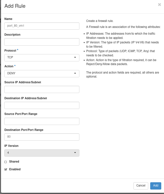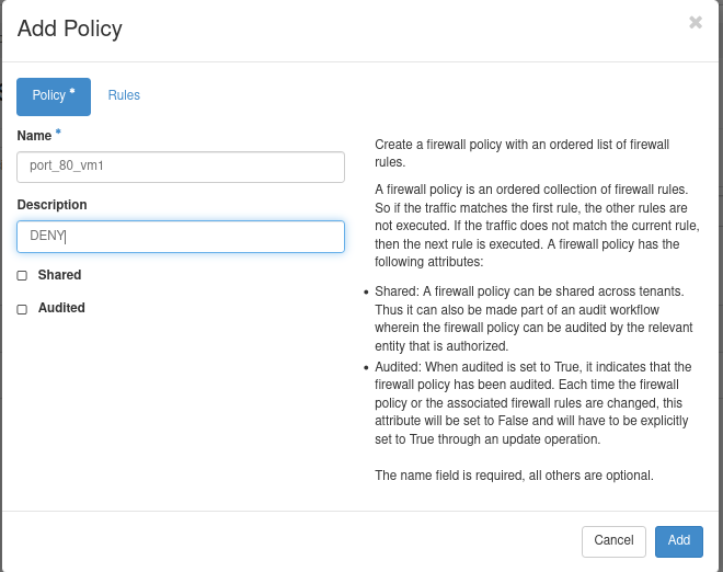 Regulile în OpenStack FWaaS (Firewall-as-a-Service) se configurează în panoul de control Horizon.