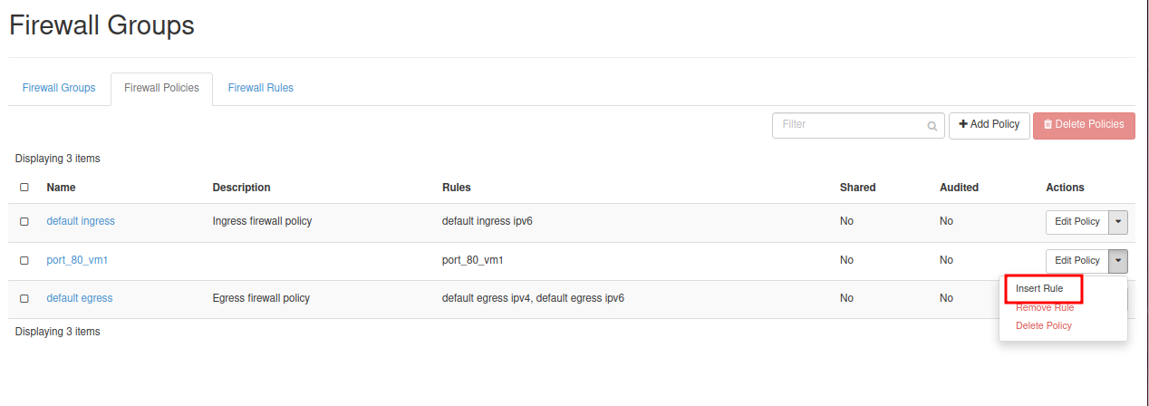 Accesați tab-ul „Policy”, selectați politica dorită. Apoi apăsați săgeata în jos și, din lista derulantă, selectați „Insert Rule”.