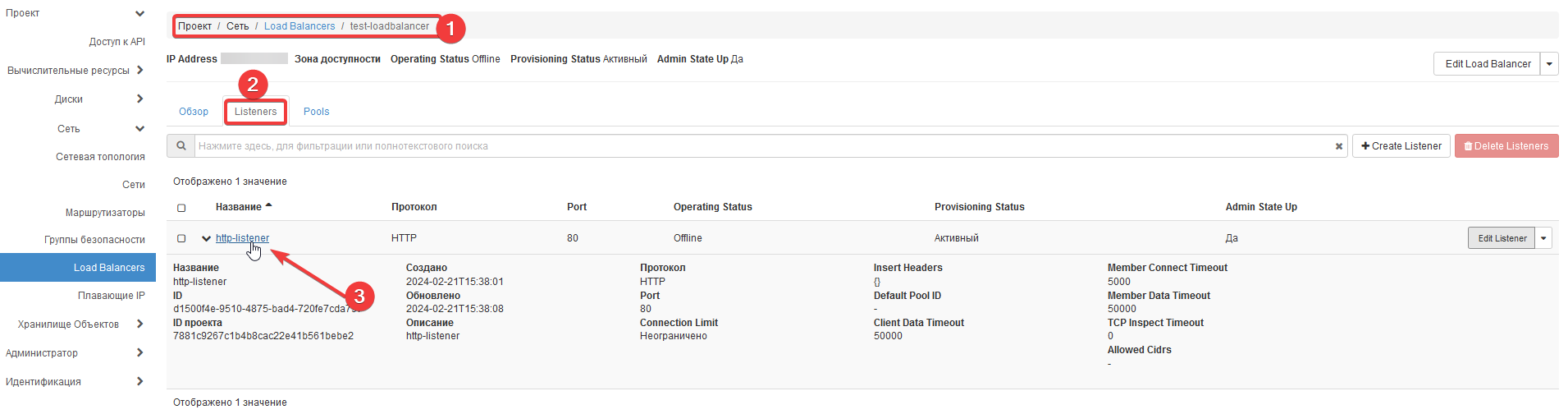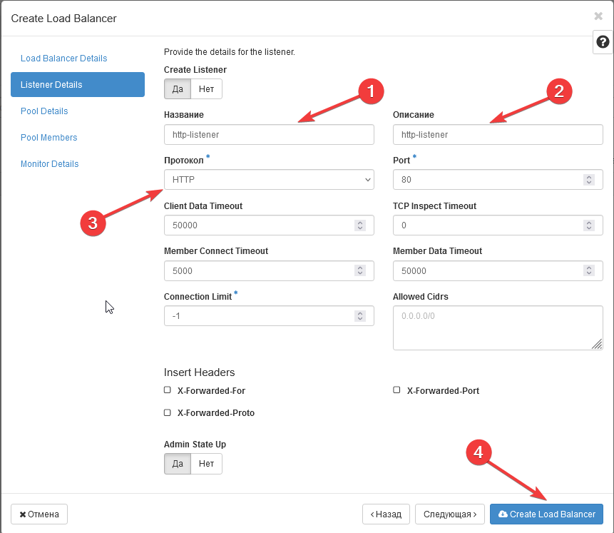 6 - Creați Listener-ul (Detalii Listener): Specificați numele și protocolul (în cazul nostru, HTTP) -> În următoarea filă "Detalii Pool" în secțiunea "Create Pool," selectați "Nu" (în acest exemplu, un pool nu este necesar) -> Faceți clic pe "Create Load Balancer."