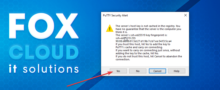 În fereastra de dialog deschisă faceți click pe "Da" pentru a continua conectarea (acest mesaj apare în scopul ca "Putty" să memorizeze serverul sau în cazul în care adresa IP a serverul se deosebește de adresa IP memorizată anterior de programul Putty pentru serverul dat)