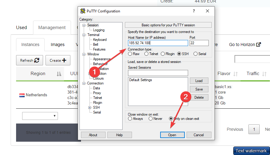 în câmpul "Host Name" (pas -1) introduceți adresa IP a serverului, faceți click pe butonul "Open" (pas-2).